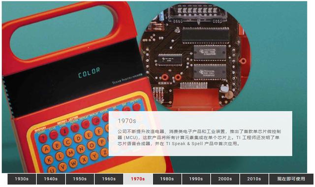 1971 年德州仪器推出了全球第一个单芯片微处理器,为计算机领域带来了新动力,微处理器的发明决定了半导体产业发展方向。1978 年德州仪器推出了第一款单芯片线性预测编码语音合成器,成为第一款可以通过电子复制模拟人声的产品。