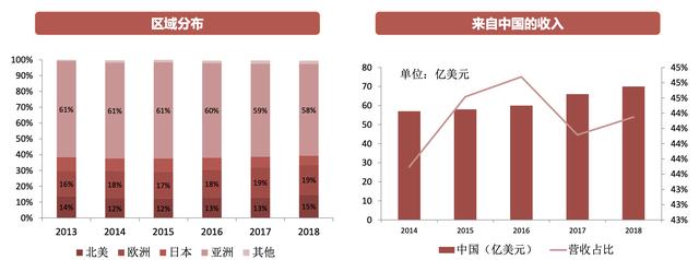 从地区来看,德州仪器有将近六成的收入来自除日本以外的亚洲市场,2018年,亚洲市场的收入占比为59%。而亚洲市场的收入主要来自于中国。根据公司披露,2014-2018年,对中国的产品销售收入57亿美元上升到70 亿美元,CAGR为5.3%,中国市场占公司总收入的比重则从2014年的43.7%上升到2018年的44.3%。2019年第二季度,对中国的销售收入为17亿美元,较去年同期的16亿美元,同比增长6.3%。