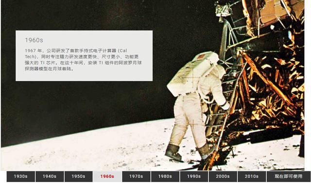 20 世纪 60 年代,德州仪器开发出晶体管逻辑芯片,使计算机逻辑方面的集成电路的使用更加普及。1964 年德州仪器开发了第一台红外线前视警戒系统,此后公司对红外技术进行改良,使得该项技术广泛运用到军事、汽车、船舶、摄像机、安防监控等领域。1967 年,德州仪器开发出第一款手持式计算器。德州仪器将工作重点转向性能更强的 TI 芯片,采用 TI 组件的阿波罗月球探测模块在 1969 年登上月球。