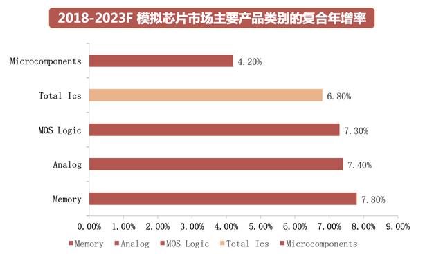 在电源管理、讯号转换与汽车电子三大应用的带动下,模拟芯片市场在2018~2023年的复合年增率 将达到7.4%,优于整体IC市场的6.8% 。2017年全球模拟芯片市场的规模为545亿美元,预估到2022年时,市场规模将达到748亿美元。信号链占比30%,电源管理占比70%。