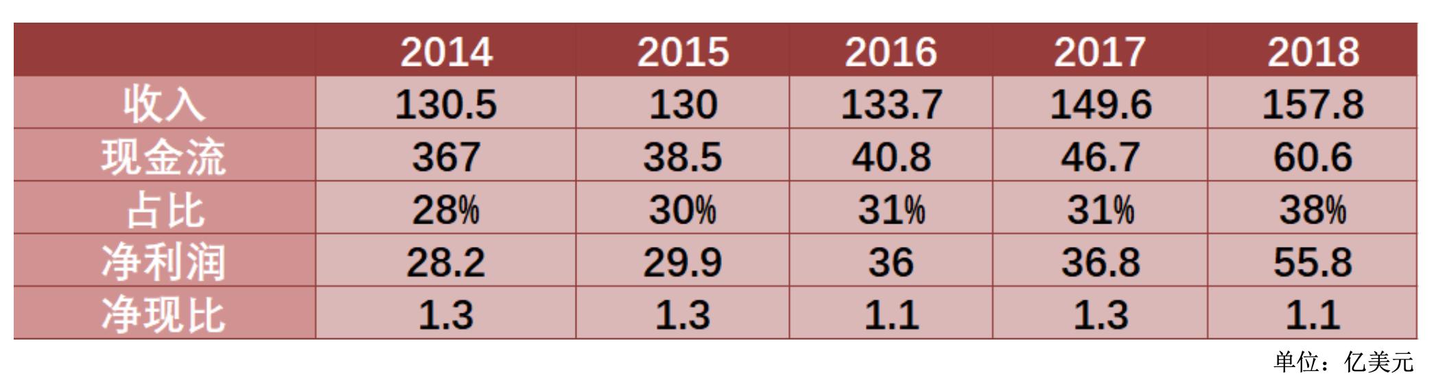 公司通过经营活动获取现金流的能力相当强大。2014-2018年,公司的经营活动现金流净额从40.5亿美 元上升到71.9亿美元,自由现金流则从36.7亿美元上升到60.6亿美元,几乎实现翻倍。公司的自由现金流比率近年来不断上升,从2014年的28.1%上升至2018年的38.1%,说明公司将营业收 入转化为自由现金流的能力相当优异。 同时,公司的净现比(经营活动现金流占净利润的比重)也始终保持1.2倍以上,净现比大于1,说明公司的净利润中含现金量充足。