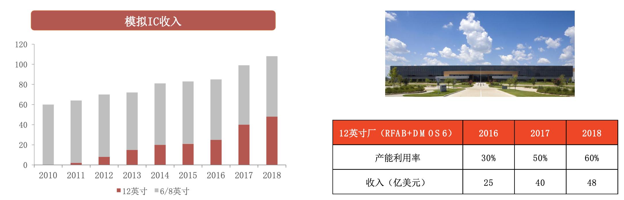 有2家位于德州的300mm晶圆制造厂。这两家300mm晶圆厂的复合产能利用率从2017年的50%上升至2018 年的60%,未来仍存在一定的上升空间。德州仪器在最近的2019年第一季度电话会议上,表示要未来 要在德州建设第3个300mm晶圆厂。假设每一芯片的封测成本不变,生产自300mm晶圆的芯片比生产自200mm晶圆的芯片成本如果以封测后 测算则要低20%,而以未封测芯片测算则直接低40%,最终带动芯片的毛利率从60%上升到68%。 2017年和2018年,公司产自300mm晶圆的模拟芯片带来的收入分别为40亿美元和48亿美元,分别占当 年模拟业务总收入的40%和45%。