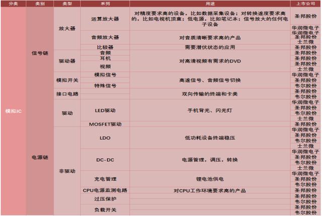 常见的模拟集成电路通常包括各种放大器、模拟开关、接口电路、无线及射频IC、数据转换芯片、各 类电源管理及驱动芯片等。最主要的两大类产品为信号链产品和电源管理芯片。