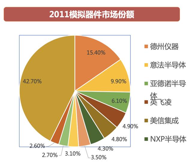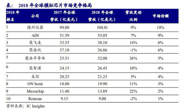 模拟电路的生命周期很长,不少模拟电路产品生命周期长达 10 年以上。 模拟电路产 品的价格通常偏低,占下游终端成本比例较小。行业普遍产品更新换代慢,利润率低导 致新增进驻企业减少,行业垄断格局不断强化。2018年德州仪器(TI)凭借模拟销售 额达108亿美元和18%的市场份额,再次扩大了其在顶级模拟供应商中的领先地位。