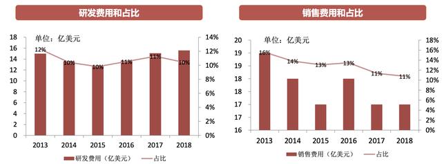 研究和开发费用(R&D)整体上控制得当,历年来占收入的比重稳定在10%左右。2018年和2019年第二 季度,公司的研发费用率分别为9.9%和4%。相比稳定的研发费用,公司的销售管理费用(SG&A)近年来则一路下降。销售管理费用率从2013年的 14.1%,总体下降至2018年的10.7%和2019年第二季度的4%,下降趋势较明显。