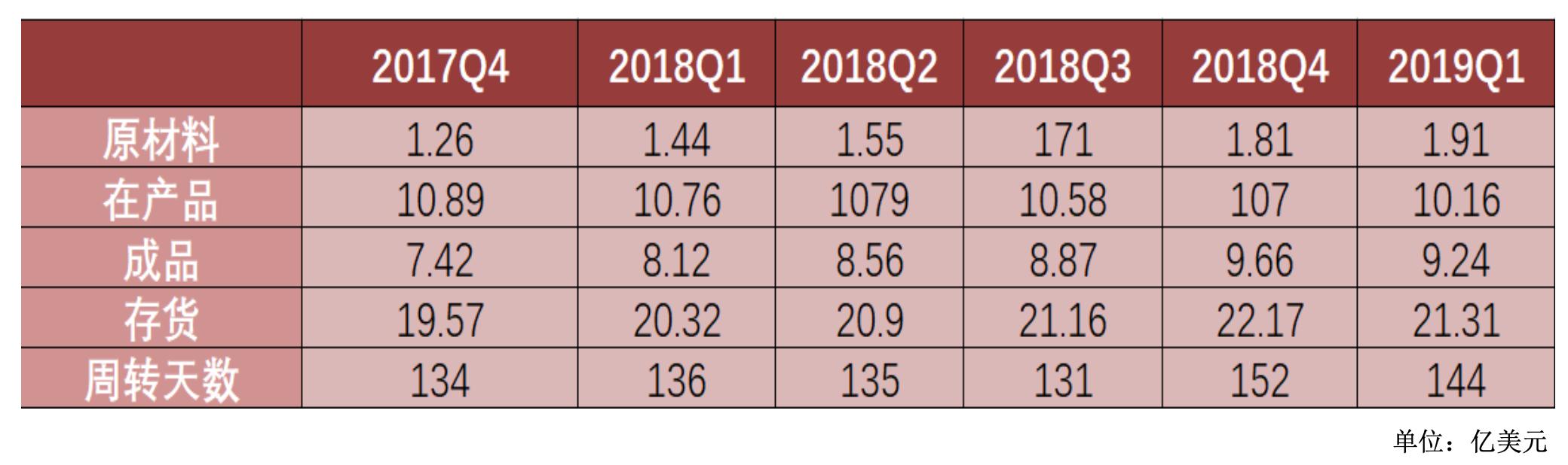 存货周转天数从2014年的114天拉长到2018年的138天,而在2019年第一季度,存货周转天数进 一步拉长,上升至145天。从存货的分类来看,存货的增加主要是由于原材料和完工产品的增加, 而在产品却比去年同期有所减少。可见,行业的周期性疲软的确对公司的存货造成了一定影响。 不过,德州仪器在2019年第一季度的财报会议上表示,公司最近季度收到的订单量仍在正常范围之内。