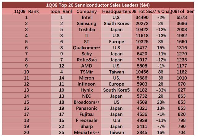 市场研究公司iSuppli资料显示,自2007年第一季度开始,高通取代德州仪器成为最大的移动芯片制造商。