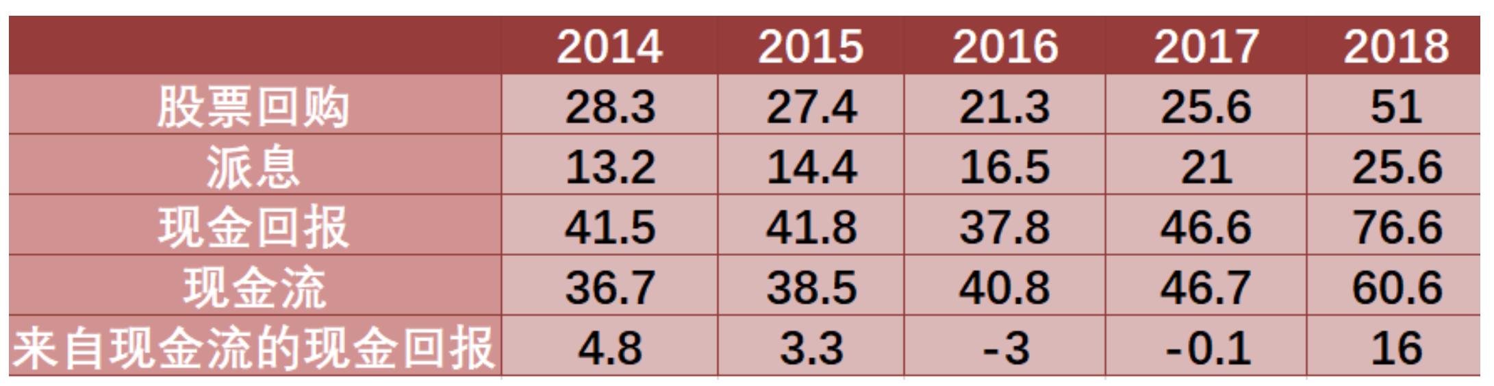 公司多年来一直表示,自由现金流只有在有效地进行再投资或者返还给股东时,才是有价值的,并且承 诺要将所有的自由现金流返还给股东。2018年,公司的股东回报高达76.6亿美元,占到当年自由现金流的126%,其中股份回购51亿美元, 派发股息25.6亿美元。2014-2018年,公司提供给股东的回报合计高达244亿美元,而同期合计的自由现金流为223亿美元— —也就是说,公司还通过融资活动额外向股东提供了21亿美元的回报。