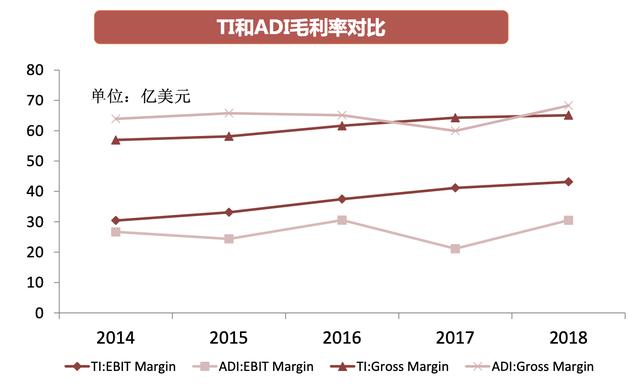 得益于上文提到过的300mm晶圆的产能提高,以及于专注于工业和汽车市场的优势,德州仪器近年来的毛利 率与模拟芯片行业第二名的Analog Devices(ADI)之间的差距明显缩小。2013-2018年,德州仪器(TI)的 毛利率从56.9%上升到65.1%,而ADI同期的毛利率则从63.9%上升至68.3%。 同时,得益于控制得当的研发费用率以及不断下降的销售管理费用率,德州仪器近年来的EBIT利润率从2013年 的30.3%上升到2018年的42.5%,明显高于ADI(2018: 30.3%)