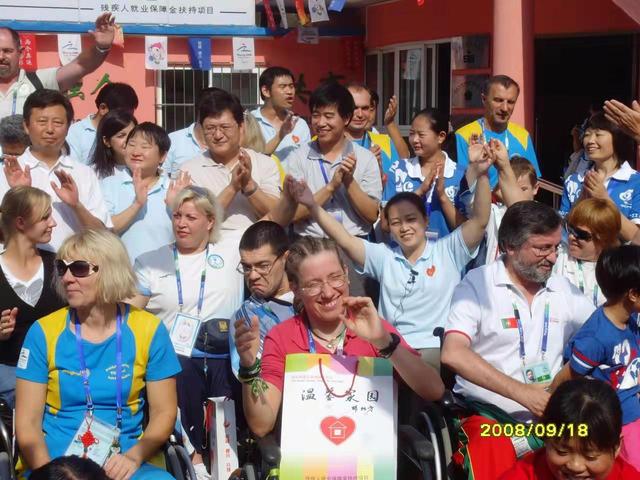 2008年,李楠和世界各国的残疾人运动员在一起。(第二排右二为李楠)