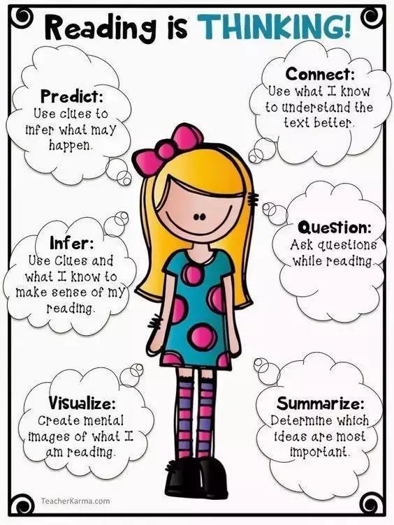任务型阅读的问题,可以围绕书里人物、信息、情节发展、矛盾产生,以及如何解决问题而展开。问题的具体形式也有很多种,但总的来说,还是这样几类:预测 (Predict) 、推断(Infer)、形成图像(Visualize)、联系 (Connect)、提出问题 (Question)、归纳概述 (Summarize)。