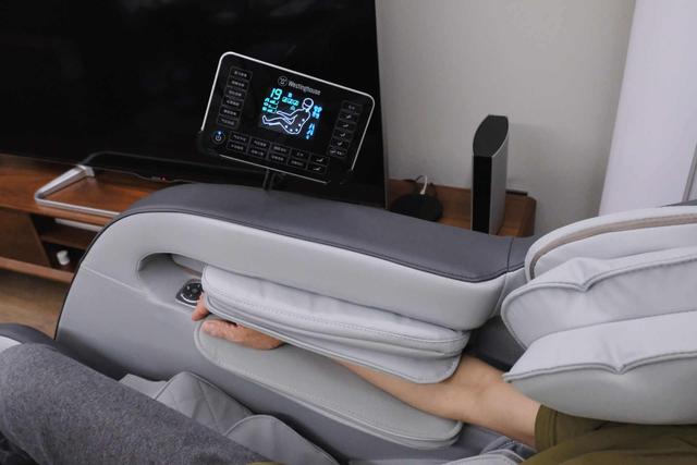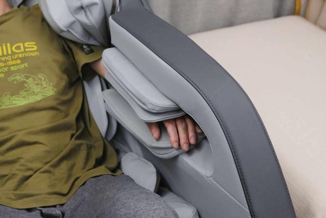 除了液晶触摸操控外,在内置扶手处还保留了独立操作按钮,不需要抽出手,通过盲操就可以进行力度、角度调整及暂停。有时临时有事需要处理或者想调节下力度,即使气囊在夹捏,可以随时暂停或者调整,这点真的很贴心。要知道,气囊夹捏的时候,手是无法控制液晶触控屏的,这个小键盘就完美解决这个问题了。