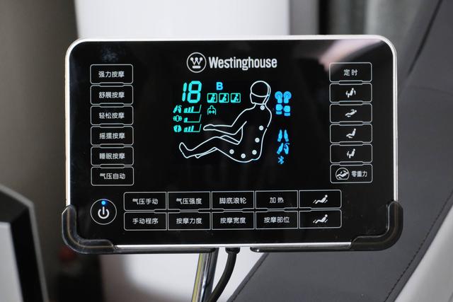 西屋S500的控制器采用了超大液晶触控显示屏的形态呈现,逼格满满,控制器包含了开关机、自动程序选择、加热、角度调节、调节机芯按摩力度、气囊按摩力度、自定义组合程序等等。