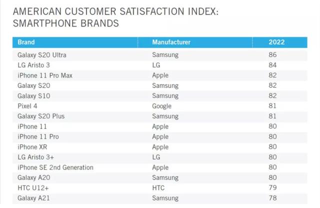 数据显示,三星Galaxy S20Ultra比86分满意度高居榜首,成为美国消费者最喜欢的智能手机。第二名为LG Aristo3,可惜这个品牌去年就宣布退出智能手机领域,未来也不会有新的产品发布。 iPhone 11 ProMax和三星Galaxy S20、三星Galaxy S10并列榜单第三名,作为苹果最后一款4G高端机型,这样的表现确实不算太亮眼。