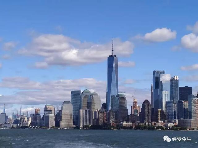 吃过早餐,旅游车载着我们再次回到纽约。游目所至,平坦无垠的大地朦朦胧胧地显现出工厂、油罐的身姿;起降繁忙的机场,河上游弋的船只,栉此鳞比的别墅庭园,构成一幅幅生气勃勃的图向。经过一小时的车程,我们来到哈德逊河的轮渡码头。购票登上游轮后,回首眺望,湛蓝的天空下,曼哈顿犹如浮在水上的城市,雄伟壮观,熠熠生辉。