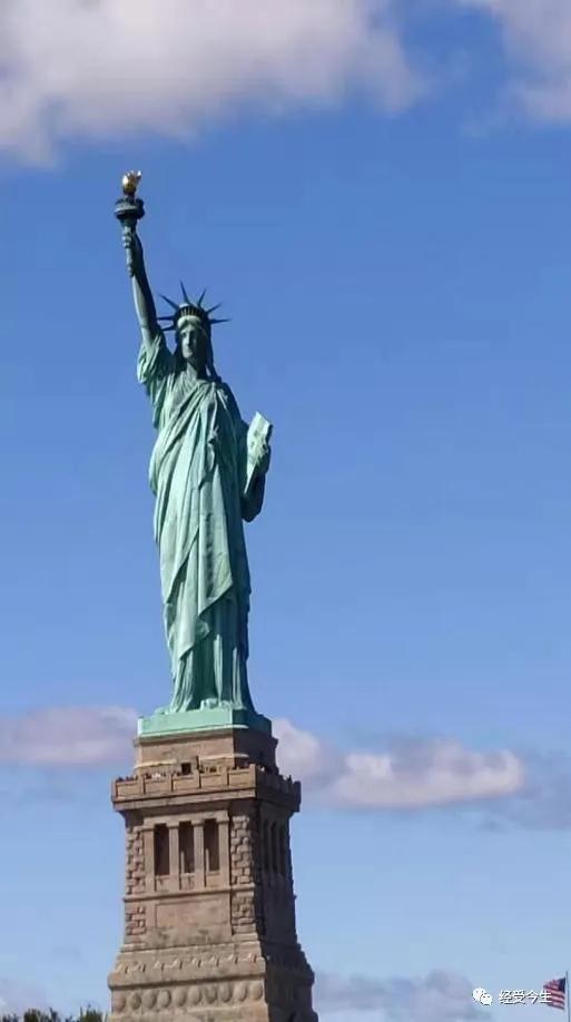 随着游船的前行,我选择游船顶层的一个位子坐下,目的是在保护脚上的皮鞋,不让鞋底脱胶部位扩大,以此掩盖我的窘态。随着游船的前行,哈德逊河口的自由女神像映入眼帘。只见她左手拿着《独立宣言》,右手高举火炬,远望前方,仿佛像我们招手致意,迎接我们的到来。这座自由女神巨像建造于1876年,是法国为庆贺美国独立一百周年而赠送的礼物。她不仅象征着美国的自由民主精神,而且凸显美利坚合众国博大的心胸。一百多年以来,这座自由女神像,召唤了憧憬自由、怀揣梦想而来的一批批外来移民,并见证他们之后的成功与挫折,光荣与梦想……
