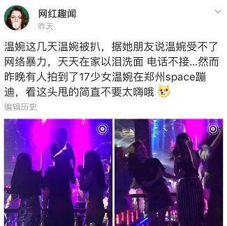 近期“被扒”风波出现后,其朋友曾出面称“温婉天天以泪洗面,电话不接”,随即有网友爆出她在夜店的“蹦迪甩头图”,人设再造土崩瓦解。