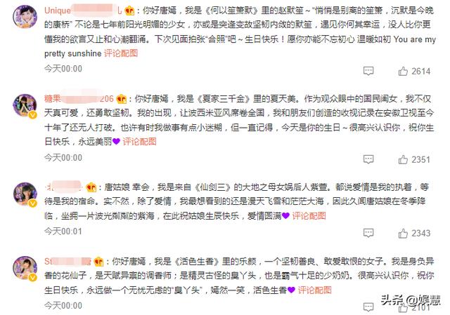 前20多名都是粉丝提前写好的文案,用的是唐嫣在影视剧中扮演过的角色,以人物的口吻为她送上生日祝福。