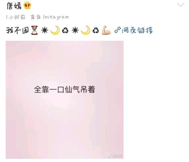 爱豆新闻讯 许久没有冒泡的唐嫣今天同时更新了INS和微博,没有自拍只有一张表情包“全靠一口仙气吊着”,并配文说“我不困⏳☀️🌙♻️☀️🌙♻️💪 ”。