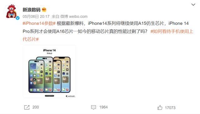芯片上,小道消息显示iPhone 14搭载的依旧是上一代A15仿生芯片,而iPhone 14 Pro与Pro Max将采用新一代的A16处理器。对于此操作,一些数码博主评论说难道是芯片性能过剩了吗?也有网友说,可能是为了将Pro系列和基础款拉开更大的差距,但继续使用A15芯片,那就有点不苹果了。