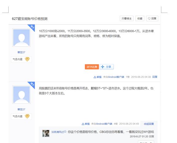 很多玩家都知道,《逆水寒》是一款很"值钱"的游戏。而游戏627周年庆上线藏宝阁这个消息一经推出,贴吧里就有不少玩家在讨论自己的号能值多少钱。但其中就出现了这么一些人,在藏宝阁还没上架的时候,就在贴吧里面发表"游戏账号不值钱,10万分的号也就1000-2000而已"的价格预测帖子,结果等今天"藏宝阁"上架后账号比预测高了几倍,今天贴吧流行问候那些估价大佬,"脸疼吗?"