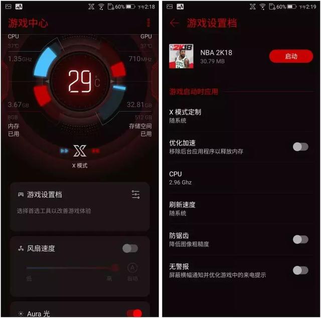 把长时挤压设置为开启X模式,配合开启时的专属动画特效,看起来倒是相当酷炫。所谓的X模式跟很多手机游戏模式类似,搭载的2.96GHz骁龙845进入满血状态。