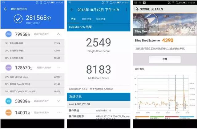 超频到2.96GHz的高通骁龙845,外加LPDDR4 8GB运存,ROG Phone的跑分基本没了悬念。照例第一轮安兔兔,轻松破28万大关,但多次也没能冲破29万(跑分测试都在X模式开启下进行),3D Mark的Sling Shot Extreme项也得到了4390分。超频带来的单核性能表现更强势,Geekbench4单核CPU的2500以上的跑分成绩也表现出了更强的优势。