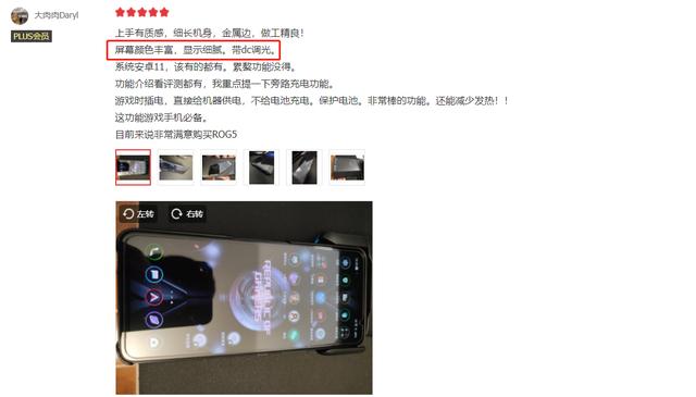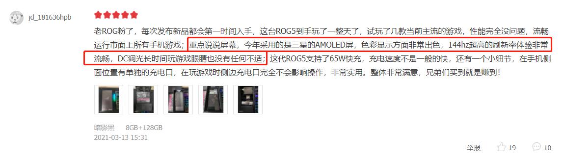 一般来说,游戏手机的性能配置已经没有太多可说的了,像骁龙888+LPDDR5+UFS3.1这样的性能三件套,基本是今年每部游戏手机的标配了。而今年的ROG游戏手机5,似乎在屏幕方面带来了不少改变,尤其是老ROG粉直言今年ROG新机采用的是三星的AMOLED屏,“色彩显示方面非常出色”、“显示细腻”、“DC调光长时间玩游戏眼睛也没有任何不适”。由此可见,今年ROG游戏手机5换上144Hz的三星电竞屏,确实在色彩方面带来更为突出的显示效果。