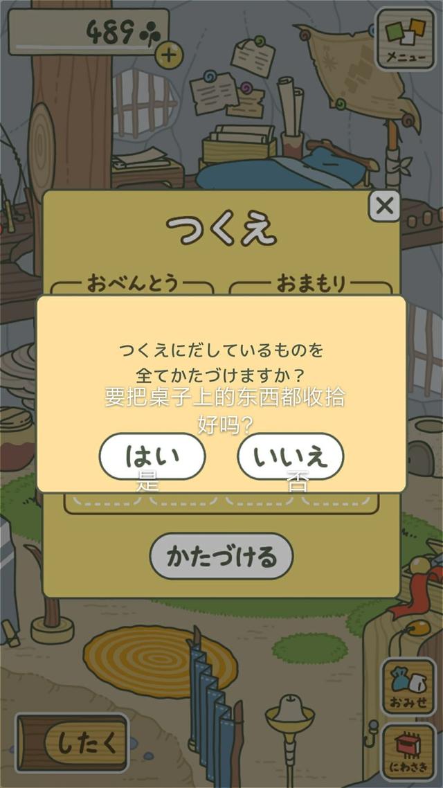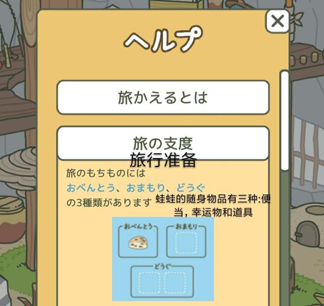 注意:皮包里的下面那个键是“完毕”,准备好了,蛙蛙就可以带着这些之后旅行去了,而桌子上的是你不在的时候蛙蛙拿着旅行去的,如果皮包里不准备,桌子上也不准备,它可能就会待家里。