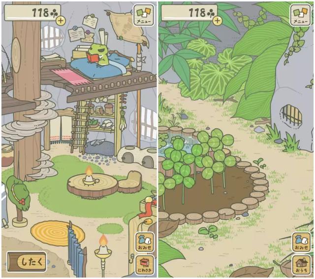 4. 三叶草可以在商店里买食物和旅行的物品,将食物、幸运物、旅行装备放入行李后,蛙蛙就会出门旅行,旅行途中会给你寄照片,回来还会给你带礼物