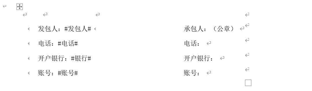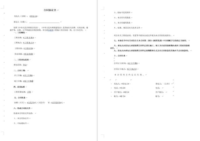 需求描述你是乙方建筑公司,手上有一份空白合同模板的Word文件,如下图: