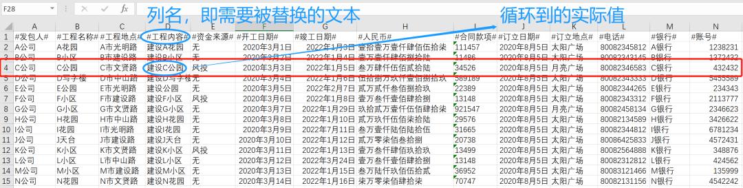 此时就明确了需要被替换的内容了,只要在模板中找到#工程内容#把它替换为建设C公园即可!了解了这个替换后,下一步就是遍历Word模板,找到对应列名替换!