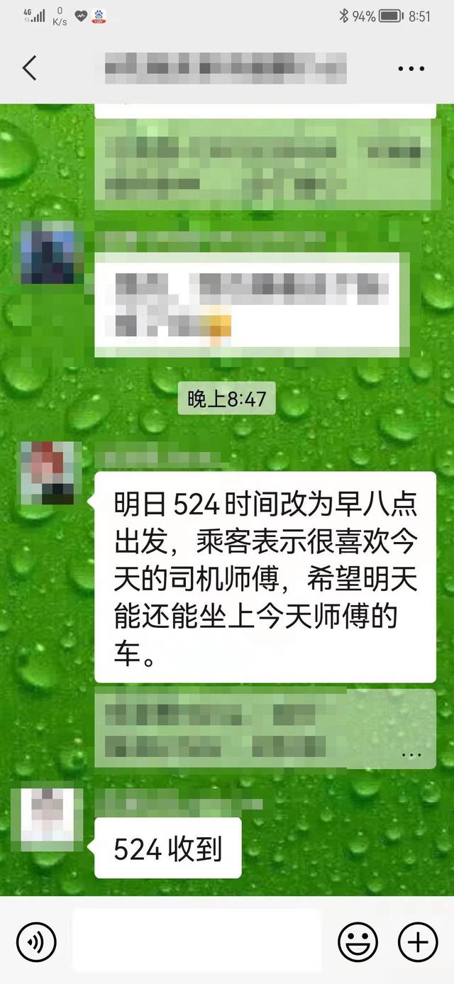 这就是截图显示点名再服务的内容:明日524时间改为早八点出发,乘客表示很喜欢今天的司机师傅,希望明天还能坐上今天师傅的车。