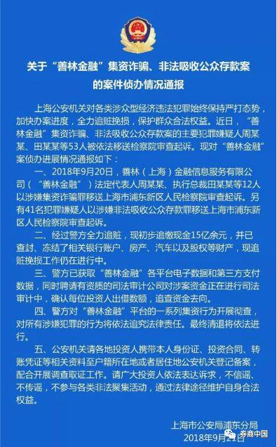 9月21日,上海市公安局浦东分局发布公告称,警方将善林金融法定代表人周某某,执行总裁田某某等12人以涉嫌集资诈骗罪移送浦东新区人民检察院审查起诉,另有41名犯罪嫌疑人以涉嫌非法吸收公众存款罪移送浦东新区人民检察院审查起诉。