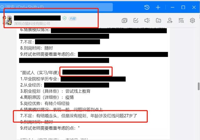 除此之外,一位与小A同被辞退的同事曾担任过面试官,向界面教育提供了一张编程猫对应聘者的评价截图,指出该女生存在“不足”,”有结婚念头,但是没有规划,年龄涉及红线问题27岁了。”