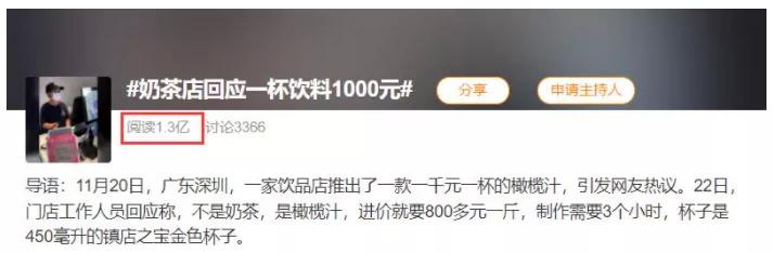 一杯果汁售价 1000 元,你会买吗?日前,深圳一家饮品店因1000元一杯的饮品引发网友热议,网友称其为“饮品界的爱马仕”。居然还要排队三小时才能买到!