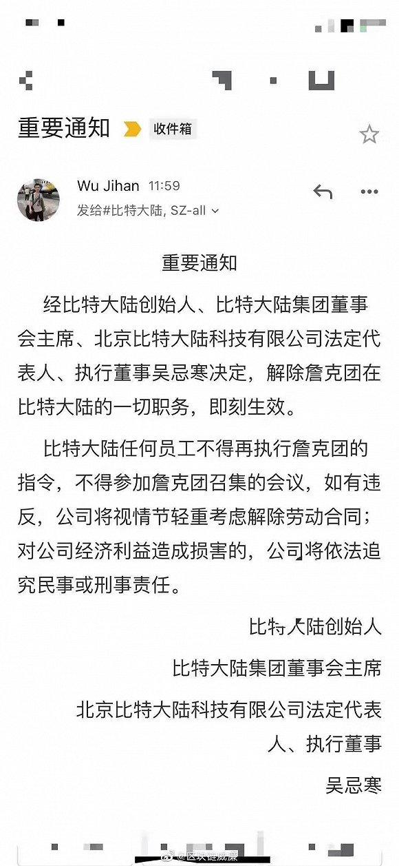 钛媒体快讯 | 10月29日消息,比特大陆创始人吴忌寒今日向员工发布内部信,称解除比特大陆总经理詹克团在比特大陆的一切职务,即刻生效。此前,詹克团还曾先后担任董事长、执行董事等职务。