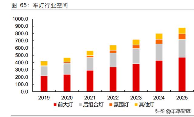 智能大灯、氛围灯和贯穿式尾灯显著提升智能电动汽车科技感,渗透率提升扩大车灯行 业空间。随着电动化、智能化趋势不断演进,如何在外观、驾乘体验、智能座舱等方面 提供差异化的体验已成为整车企业的重要课题。而车灯也承载了传统照明以外更多的功 能,基于 ADB 等功能的智能大灯、贯穿式尾灯、车内氛围灯分别从信息交互与安全性、 外观特质、座舱体验这三个维度给出了智能时代的初步答案,已成为行业发展的重要趋 势。矩阵大灯、贯穿式尾灯、氛围灯等各类车灯渗透率有望快速提升,预计 2025 年行 业空间将达到 912 亿,复合增速 15%。