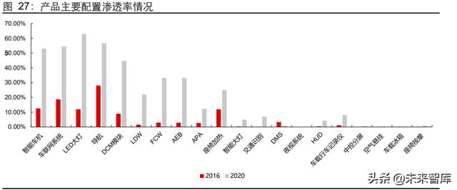 从渗透率阶段来看,目前 L2 智能驾驶进入加速渗透阶段,部分科技配置处于渗透初期。 1)高渗透率功能:过去五年实现高速渗透的产品主要是智能车机(包括对应的导航、 DCM 模块、车联网系统)以及 LED 大灯;2)渗透率提速配置:智能驾驶(LDW、FCW、 AEB、APA 等)、座椅加热;3)渗透率提速初期功能:智能大灯、交通识别、DMS、 HUD、行车记录仪、空气悬架、中控分屏等。