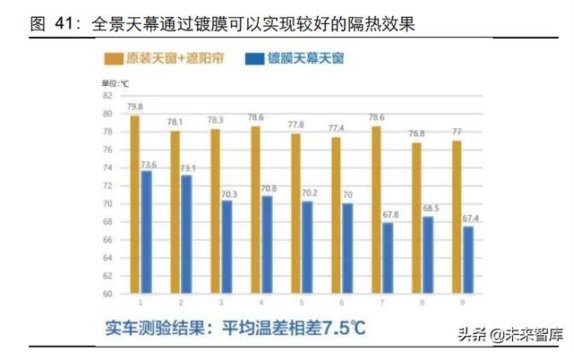 通过应用镀膜和调光等技术,全景天幕可以很好解决隔热和强光问题。全景天幕由于玻 璃面积较大,会面临高温和强光问题。针对高温问题,在镀膜+LOW-E 双重技术下,福 耀全景天幕玻璃可以隔绝 99.9%的紫外线攻击和 83%的热量伤害,不用遮阳帘,同样能 达到隔热效果。此外,通过应用智能调光技术,可以实现明暗强度可调,满足车内不同 亮度的需求。