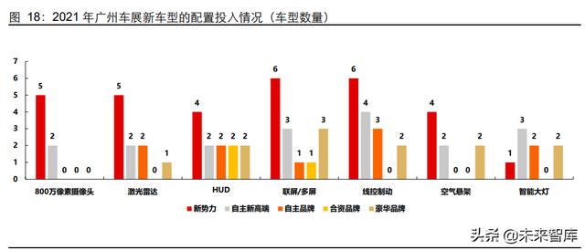 差异化配置成为自主品牌产品力上升的核心竞争力之一。从 2021 年广州车展新发布的 主要车型来看,自主品牌、造车势力不管是智能化配置还是科技配置上均领先合资品牌: 1)在智能驾驶功能上,不管是高速路段智能驾驶的投放,还是在智能驾驶硬件如摄像 头、毫米波雷达、激光雷达以及更高算力芯片的应用上均大幅投入。2)在科技配置上, 在 2021 年广州车展自主品牌推出的 19 款主力车型中线控制动配置达到 7 款、空气悬 架达到 6 款、智能大灯的配置达到 6 款。