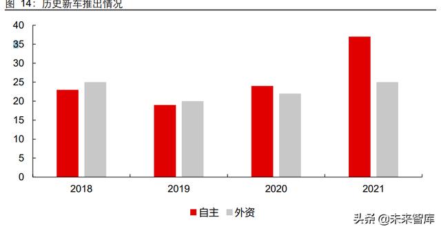 开发周期的缩短而带来自主品牌(包括新造车势力)新车推出速度的大幅提升。2018- 2021 年,自主品牌全新车型推出数量分别为 23、19、24 和 37 辆,在 2021 年车型进 入爆发期。外资品牌(包括豪华车)推出新车的数量一直在 20-25 辆徘徊。新车推出速 度的提速也代表着自主品牌拥有更多的配套机会,加速零部件市占率的提速。