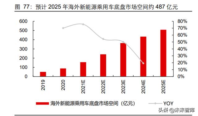 场空间:国内方面,2025 年新能源乘用车底盘市场空间有望达到 408 亿元,2020- 2025 年复合增速为 51.4%。其中转向节、控制臂、副车架和电池盒市场空间分别为 24、 56、125、203 亿元,2020-2025 年复合增速分别 56.6%、56.1%、55.0%、47.8%。海 外方面,2025 年海外新能源乘用车底盘市场空间有望达到 510 亿元,2020-2025 年复 合增速为 41.6%。其中转向节、控制臂、副车架和电池盒市场空间分别为 30、69、 157 和 254 亿元,2020-2025 年复合增速分别为 46.4%、46.0%、44.9%和 38.2%。