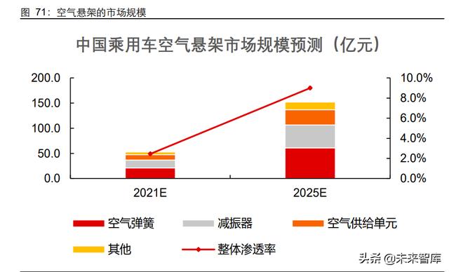 随着消费升级与国产化降本,空气悬架作为高端个性化配置未来有望在 25 万元以上车 型加速搭配,预计 2025 年搭载量超过 200 万套,单车价值超过 7000 元,合计市场规 模超过 170 亿元。