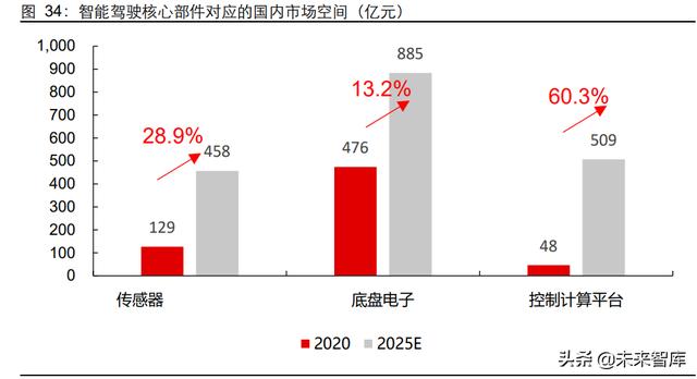 2025 年国内智能驾驶核心部件的市场空间将达到 1852 亿元,主要环节包括传感器、底 盘电子和控制计算平台。各个核心部件的产业成熟度不同,对应产业的投资逻辑也有所 差异,但最关键如何寻找国内企业在不同环节下突破的机会。智能汽车的毫米波雷达、 底盘电子等相关领域目前被国际 Tier1 垄断。座舱电子壁垒相对下降,国内企业已经深 度参与。摄像头对算法要求较高,Mobileye 以新进入者身份占据较高份额。计算平台和 域控制器作为 L3 级的新增市场,目前仍处于空白。目前不同环节产业的成熟度不同, 对应国内公司的机遇也有所不同。我们认为: 1)传感器:向中低端车型渗透带动国内 企业国产化放量,形成规模效应;3)底盘电子:安全等级较高,初期较难突破,但随着 车企自主可控的需求有望诞生国内博世级别的企业; 3)控制计算平台:芯片格局驱动 计算平台的格局,英伟达、华为产业链值得关注;