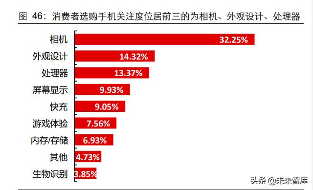 5 成长路径:增量型或平台型企业有望胜出智能手机功能从通讯到娱乐,消费者购机的选择较传统手机有较大的差异,带来零部件 的变迁。中国手机用户对于智能手机最关心的元素是相机功能,并远超第二名外观设计。 对于相机功能的需求也孕育了摄像头配置的快速提升。各大厂商持续多维度升级智能手 机摄像头。以苹果为例,单机 ASP 的提升在很大程度上是由镜头升级所拉动,从 iPhone 6 Plus 到 iPhone 12 Pro,摄像头成本由 12.5 美元上升到 96 美元,摄像头 BOM 占比 由 5.8%上升到 18.68%。