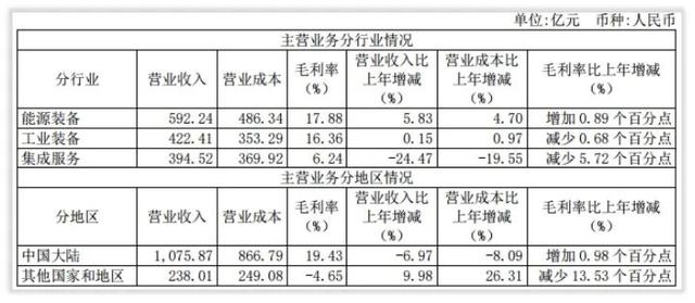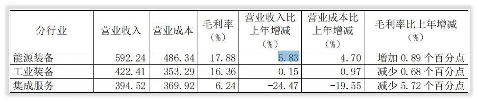 4. 2021年营业成本1114.83亿元,较2020年1139.49亿元减少2.1%。能源装备同比增长4.7%,工业装备同比增长0.97%,集成服务同比减少19.55%。