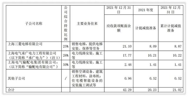 上海电气子公司上海三菱电梯有限公司、上海电气承广电力工程有限公司、上海电气输配电集团有限公司及其它子公司,对恒大集团应收款账面余额42.29亿元,2021年应收款项计提减值准备20.23亿元,对净利润影响为损失7.61亿元。