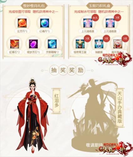 活动介绍:活动期间,账号下最高角色等级≥30级且未被封停的少侠,可扫码前往微信公众号参与“国韵华裳”活动。活动通过绘图制衣等过程,再现大宋水袖华裳的韵美,参与就有机会免费获得永久时装,除此以外,少侠还可获得抽奖机会,成为大宋锦鲤,领取周年庆新时装:红泪多(永久)及《新天龙八部》天山手办典藏版。