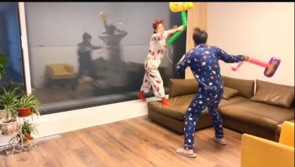 五一放假期间,两个人在家里客厅玩起了蒙眼棒槌巅峰对决赛,身着家居服的陈芊芊,跳上沙发手拿充气棒槌往下砸,袁成杰的头发都被砸飞了,棒槌也直接折成两段。